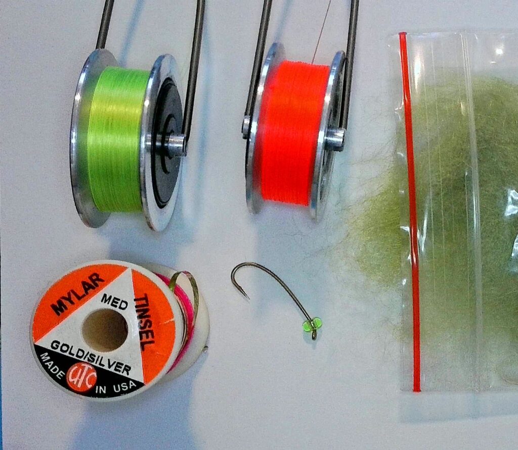- Slide the bead onto the hook (clear green plastic bead) and secure the hook in the vise.