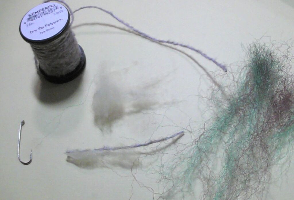 - Body:Semperfli dry fly polyyarn (pale brown), Superfine Antron (golden olive).