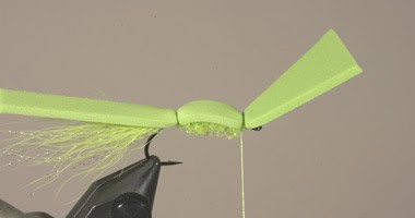 Tie down the foam body behind the hook eye at the base of the triangle. Make several tight wraps.