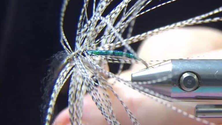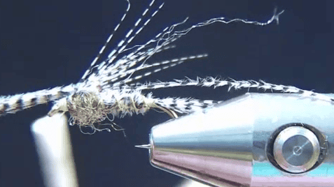 - Place the fibres horizontally at the tie-in point, extending about a hook gap back. Pinch-wrap them to form the scud’s antennae.